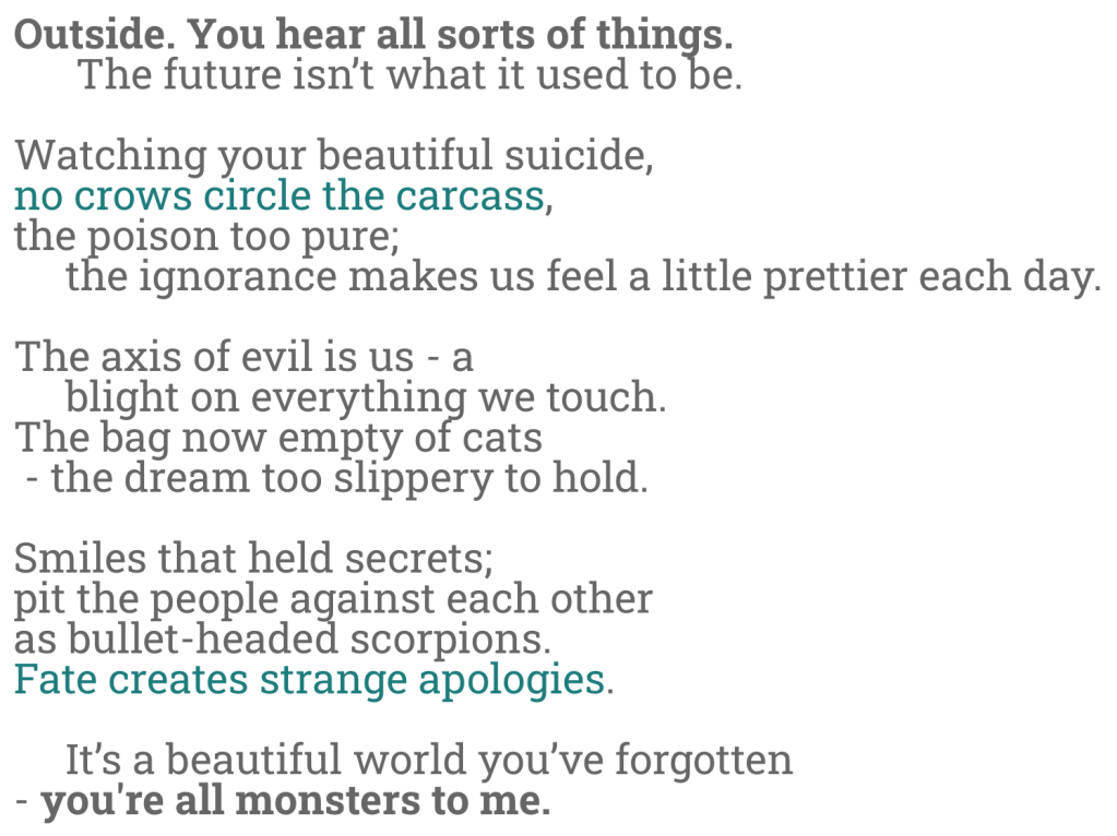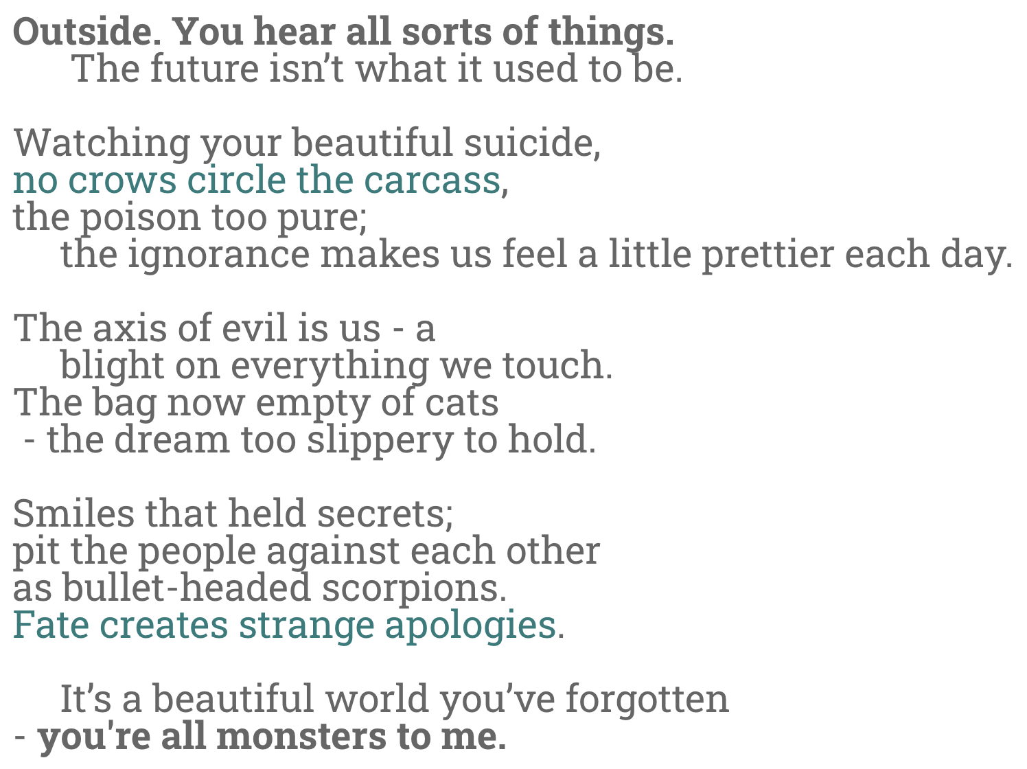 ‘Fate creates strange apologies’ from this post at Poetry Culture