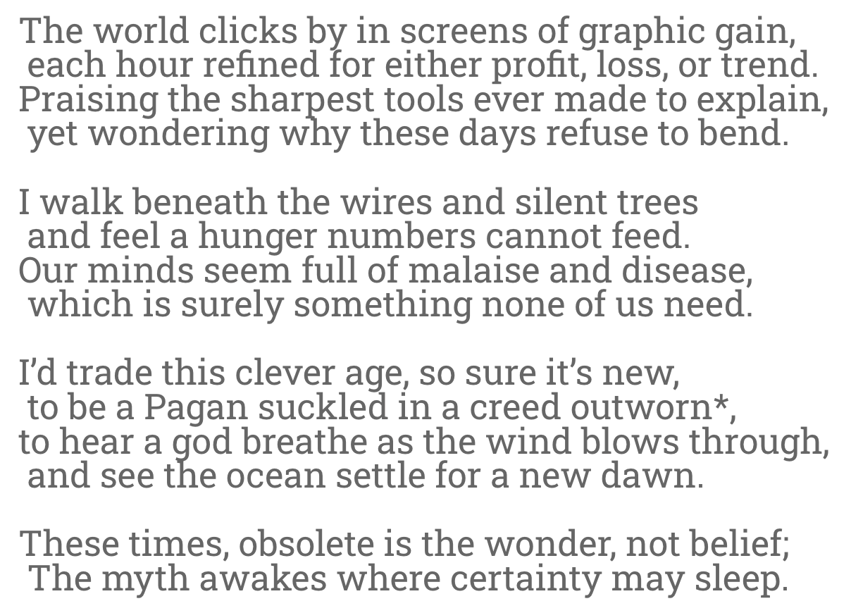 I’d trade this clever age, so sure it’s new, to be a Pagan suckled in a creed outworn*, to hear a god breathe as the wind blows through, and see the ocean settle for a new dawn.