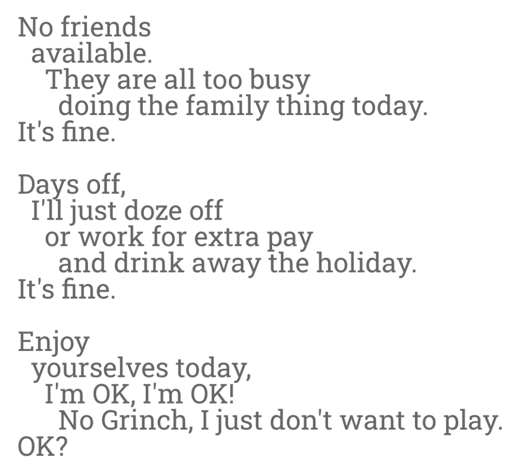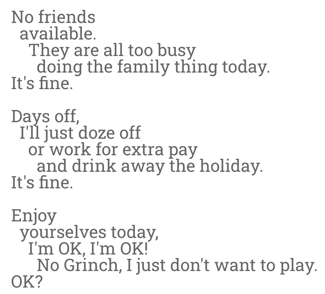 I walk beneath the wires and silent trees and feel a hunger numbers cannot feed. Our minds seem full of malaise and disease, which is surely something none of us need.