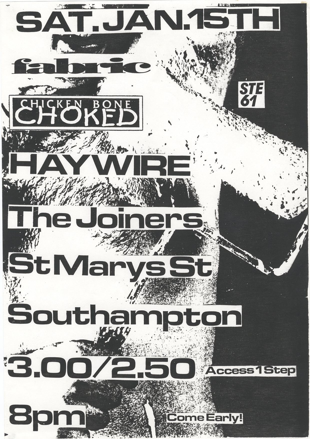 Me and Broni talked for about an hour about Fatty. She’s really upset with him too. Since Thursday I hadn’t been very nice to Broni cos I was unsure of myself. After pizza, we went home and practically fell asleep! Later we headed on up to the Joiners and had a great time watching Haywire (Broni wants to play sax with them!), Chicken Bone Choked (brilliant set!) and Fabric. Only saw two songs of Fabric – their guitarist was the spitting image of Rob!