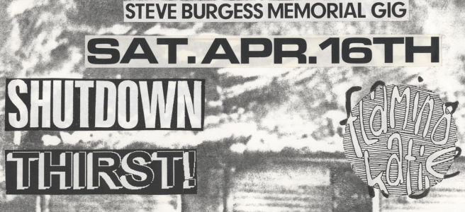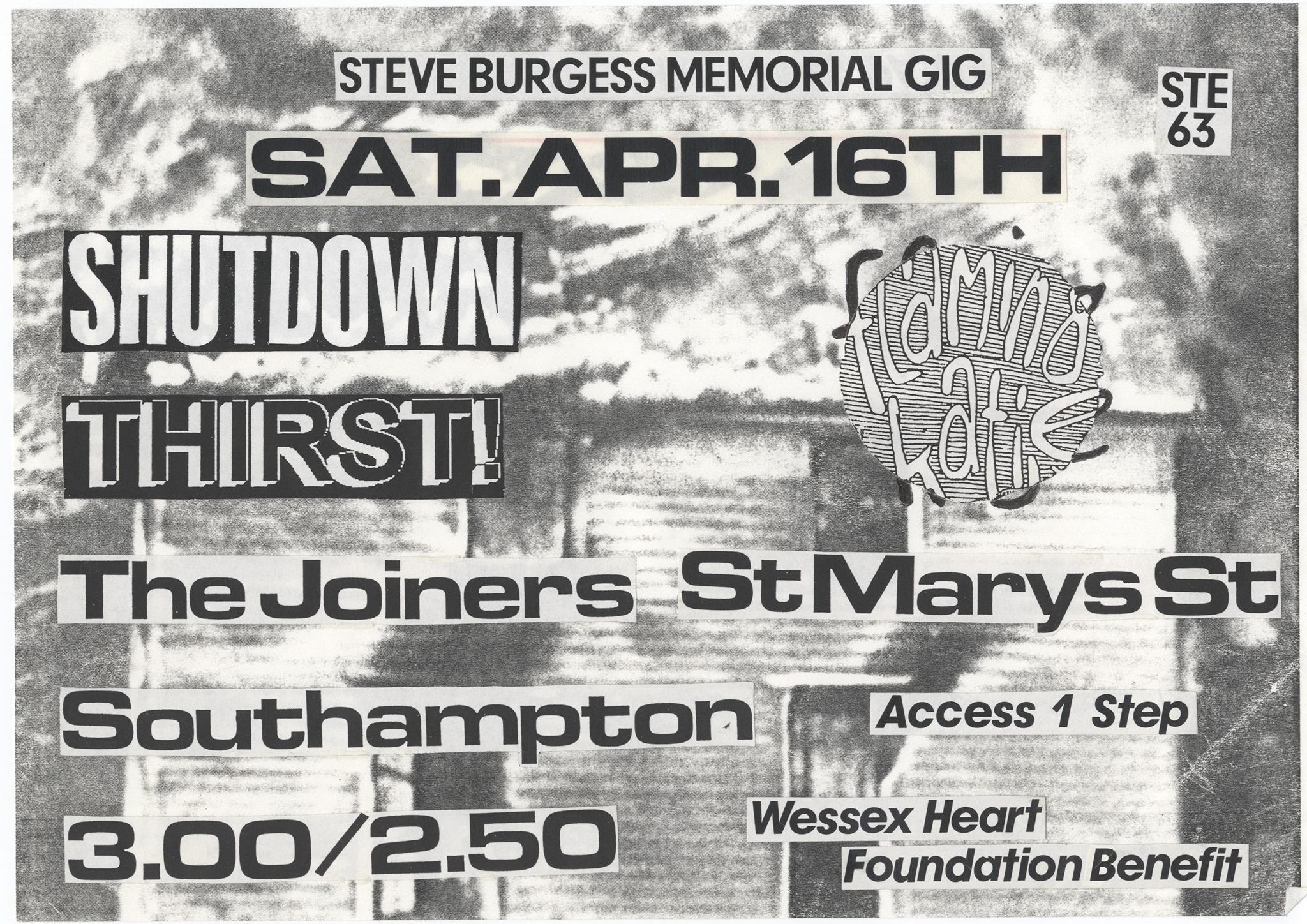 “This was an emotional night. Steve’s memorial gig (there was also another remembrance gig around the same time at our old school Alderman Quilley in Eastleigh) saw his old band THIRST! continue with Philip Beevers from CHICKEN-BONE CHOKED joining. If we didn’t love the SHUTDOWN guys (Neil Cox, Christian Burton) already then them coming from Worcs to play this benefit gig for pretty much nothing cemented that feeling. FLAMING KATIE (Russell Pataki) played too & it was a night of both tears but also togetherness in friendship when this very close-knit scene came out to show their love and commemorate. Prior to his passing, Steve had planned to put out a poetry zine. In the aftermath, Rob & Shaun put this out as a tribute to Steve under the name ‘40,000 Reasons For Living’ (the title came from a line in the R.E.M. song ‘Texarkana’ which was played at Steve’s funeral) & the cover of the zine used the burning house photo that was on the sleeve of fIREHOSE’s ‘Ragin’ Full On’ LP. The same photo was used as the backdrop for this gig flyer.”