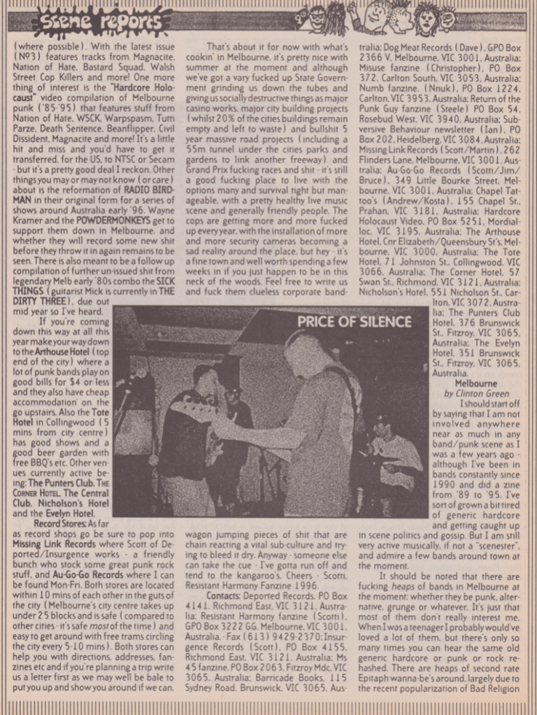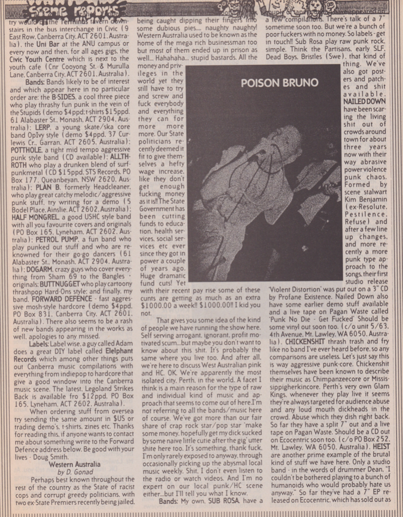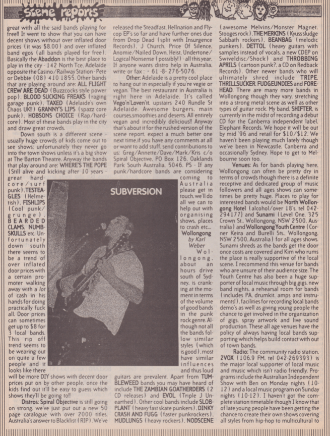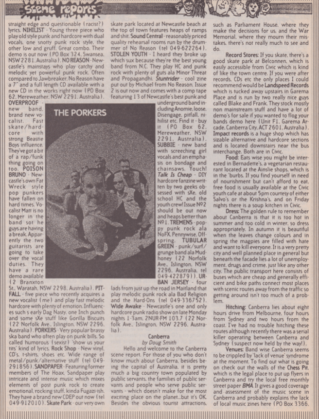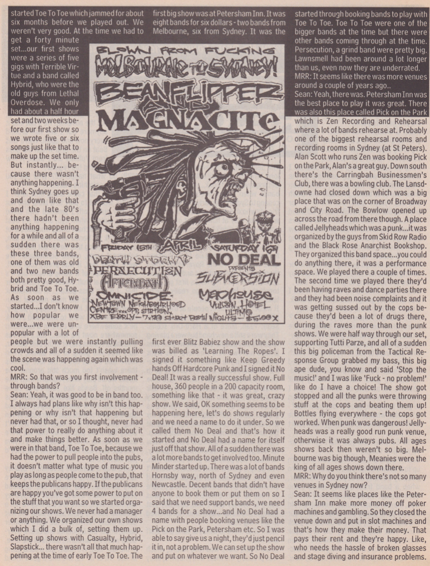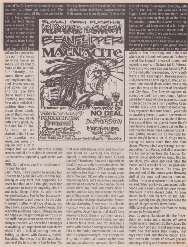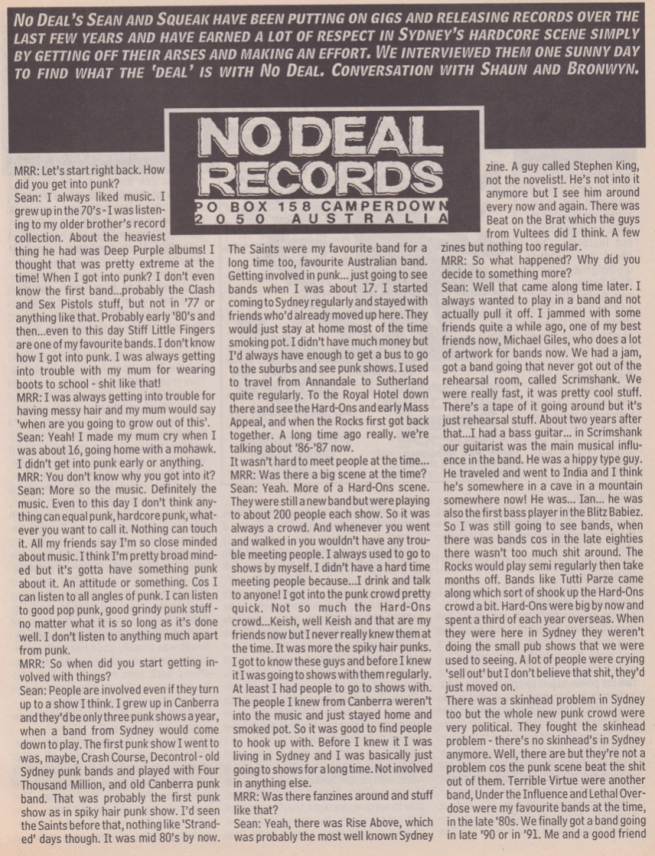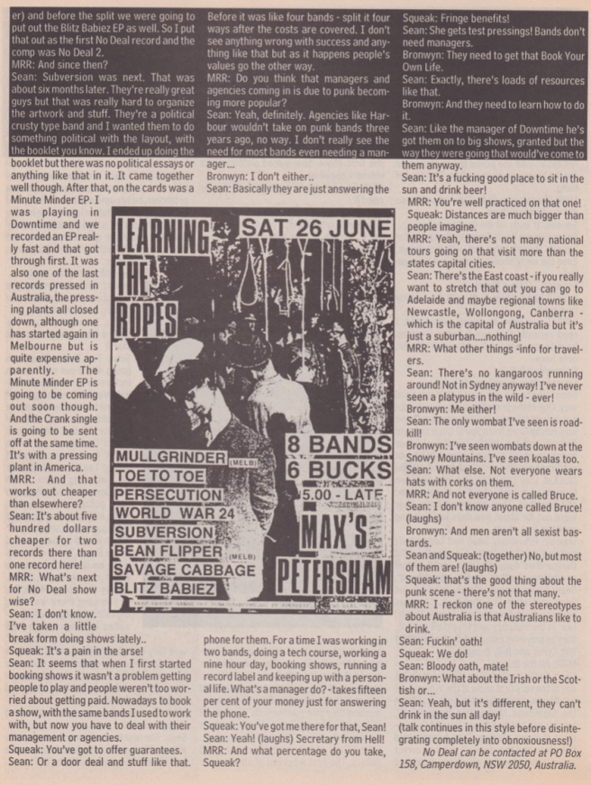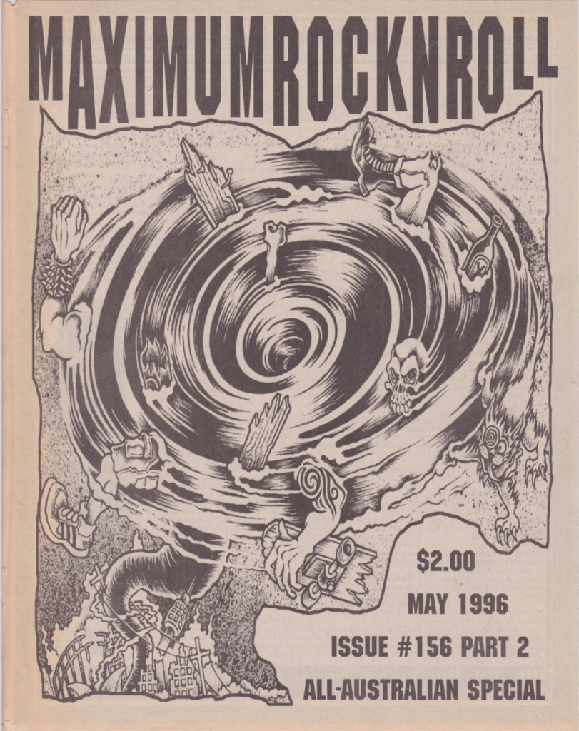 In hardcore punk terms though, Sean seemed to be the one guy everyone told me to talk to and after doing so I found out that he’s pitched to Maximum Rock ‘n’ Roll about doing an All Australian issue of the fanzine and had already started work on it. Awesome – that sounded like something I could really help out with. I threw around some ideas which were agreeable – ie – go for your life!