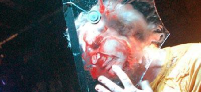 Living the role of wild, barefoot, Australian warrior spilling claret profusely in the name extreme audio violence, he knows all the visual tricks to heighten the drama. From the globs of KY jelly he ritualistically squirts into his mouth at the start of a performance, to the startled, blood and lube-smeared faces he makes up against the glass, to the stupefied stagger he employs at the turbulent climax, his public masochism has all the power of the finest greek drama. and all the gore of Texas Chainsaw Massacre.