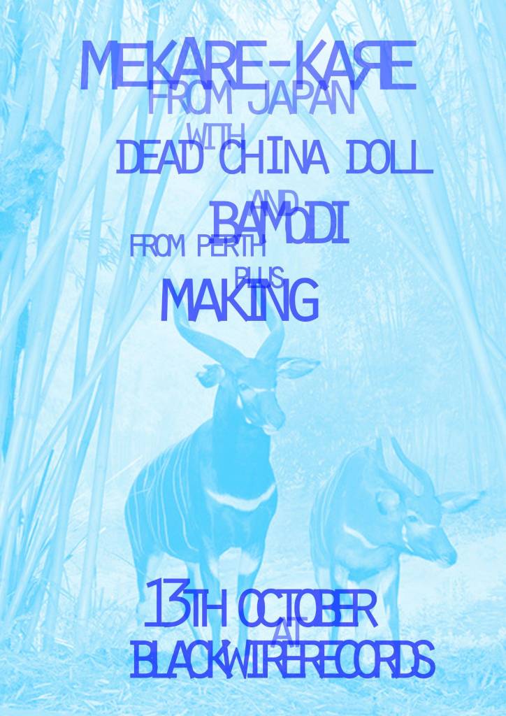 Whilst I’m away I’m a little disappointed to be missing a show I’m organising on Saturday Oct 13th at Black Wire featuring many good friends including crazy Japanese two-piece Mekare-Kare who will have a split 7″ out on Heartless Robot in time for their full Oz tour. That tour and split 7″ is with Perth gonzo’s Bamodi who will have their LP out on tenzenmen by then too! Listen to the split 7″ tracks here (released by our good Perth buddies at Heartless Robot). Rounding out the show will be the ever wonderful Dead China Doll and ever incredible Making.