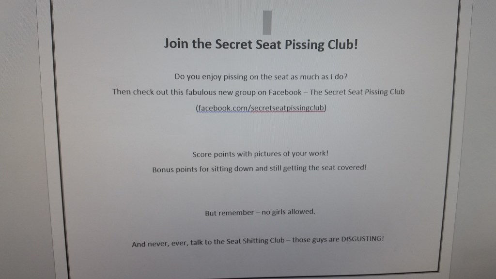 14th July 2021 – Working in an office with hundreds of other people and just 4 toilet cubicles, there’s bound to be some who are just too fucking lazy, ignorant and simple minded to clean up any mess they make. Tired of this, I made this poster for fun and stuck it up on the inside of the entrance door. The corporate environment seemed to object and I don’t think it lasted more than a few days. It made me chuckle every time I went to the bathroom though. It makes me chuckle reading it now.