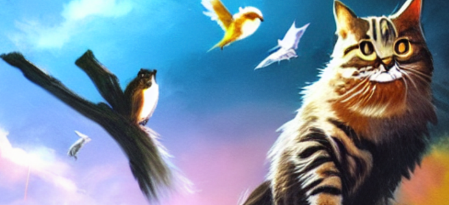 Image is AI-generated ‘a cat dreaming about birds’
