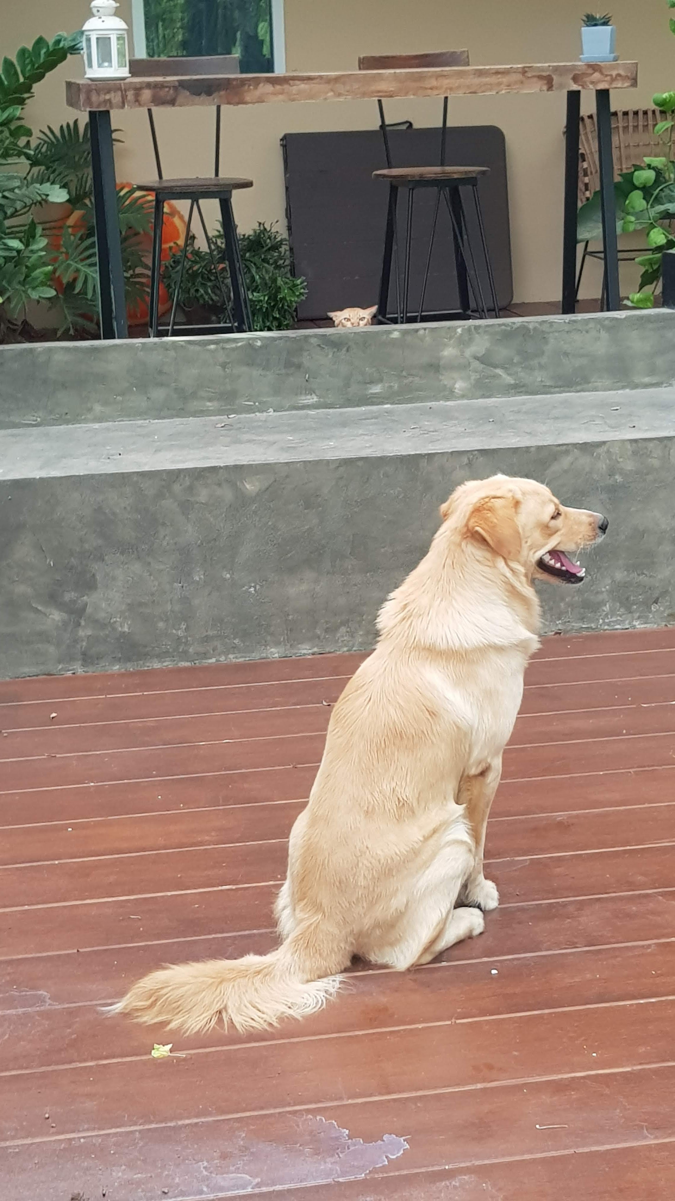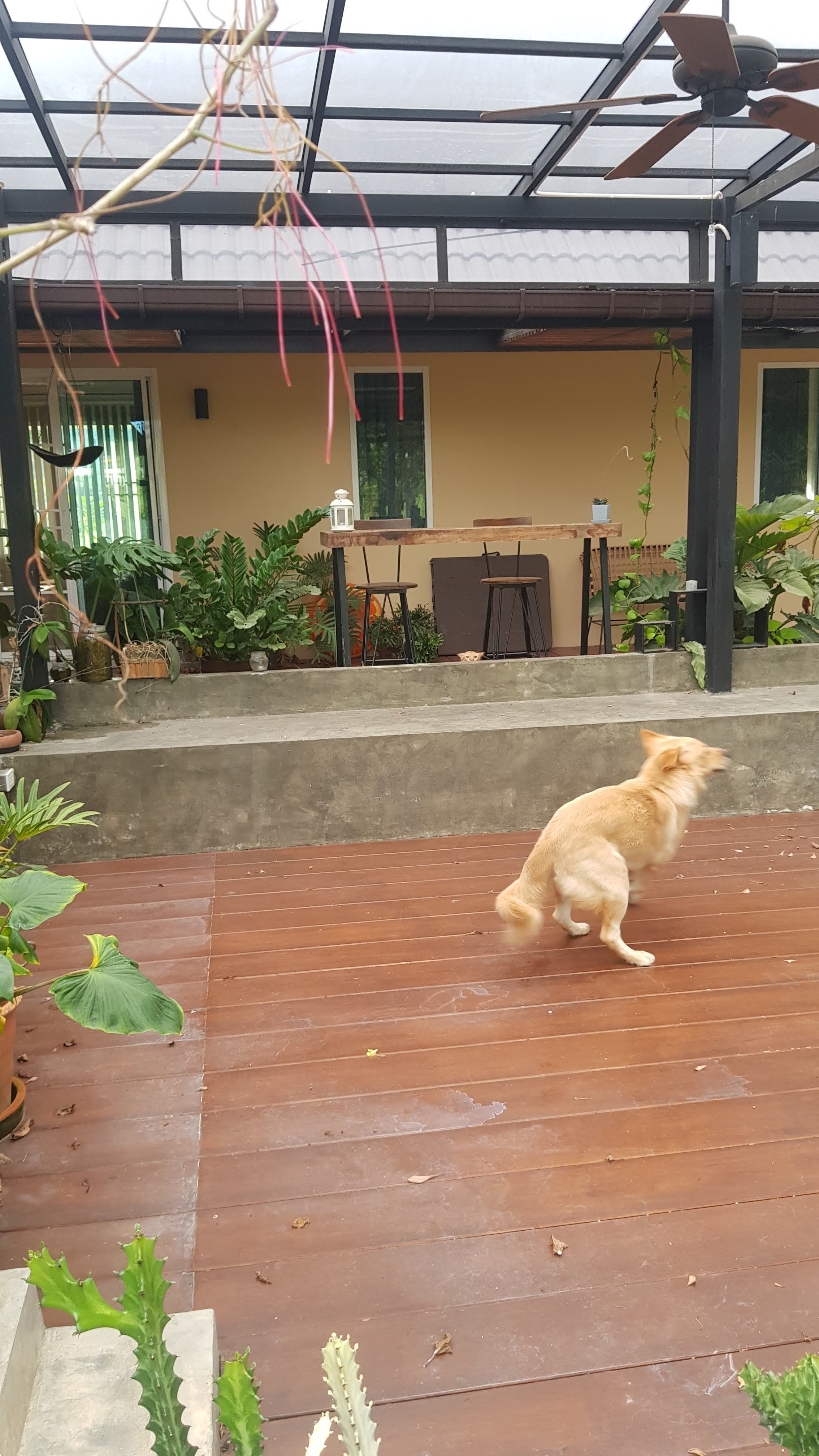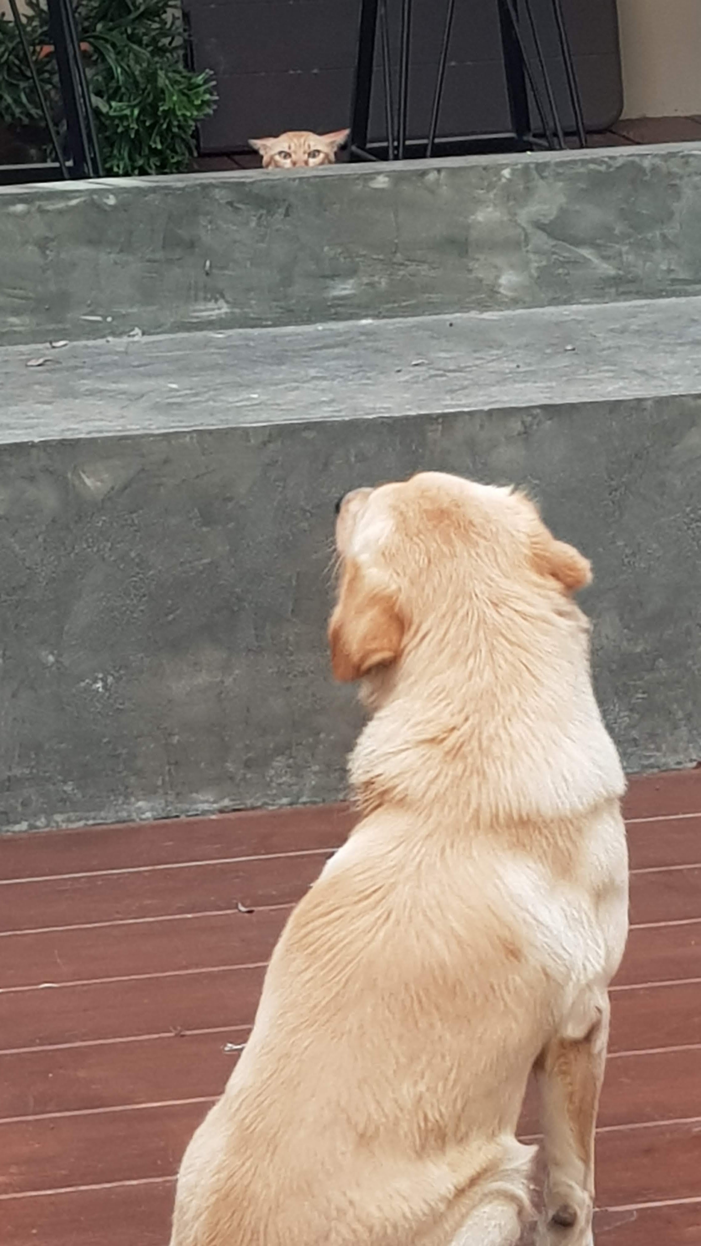 Our neighbour’s dog, Tangmo, always enjoys coming to play but tends to go a bit nuts when he sees Kim Chi, who is usually behind a screen door inside her room. Today though, we’d just let her out when he decided to come visit and after a bit of chasing around the situation above occurred.