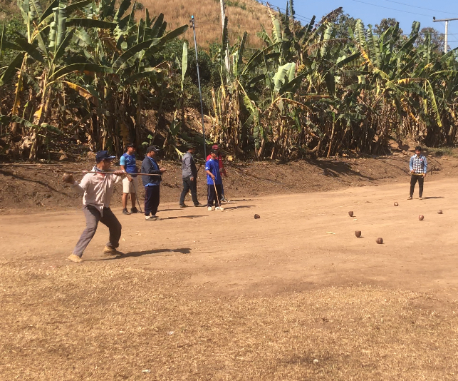 Even deeper into the valley we came across a Lahu village and gifted candy to the local kids, dressed in their traditional clothes as some event was going on. Women seemed to be up in a house on the hill whilst the men were playing a spinning top game on the playing field. These were big fist-sized tops, spun with a whipping rope. One spun an initial top and another tried to hit it with their own and then keep them spinning. We couldn’t quite make out the rules but it was fascinating to watch.