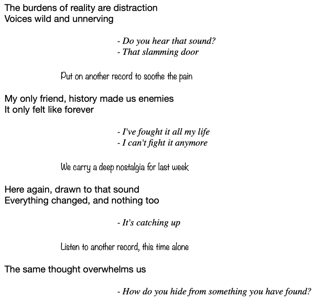This braided poem was assembled after reading a couple of posts at Sonia Dogra’s blog, borrowing the first line and then weaving together the lyrics from Nomeansno’s ‘It’s Catching Up’, with an imagined meeting with an old friend both now and in the past. Also shared with Poetic Adventures
