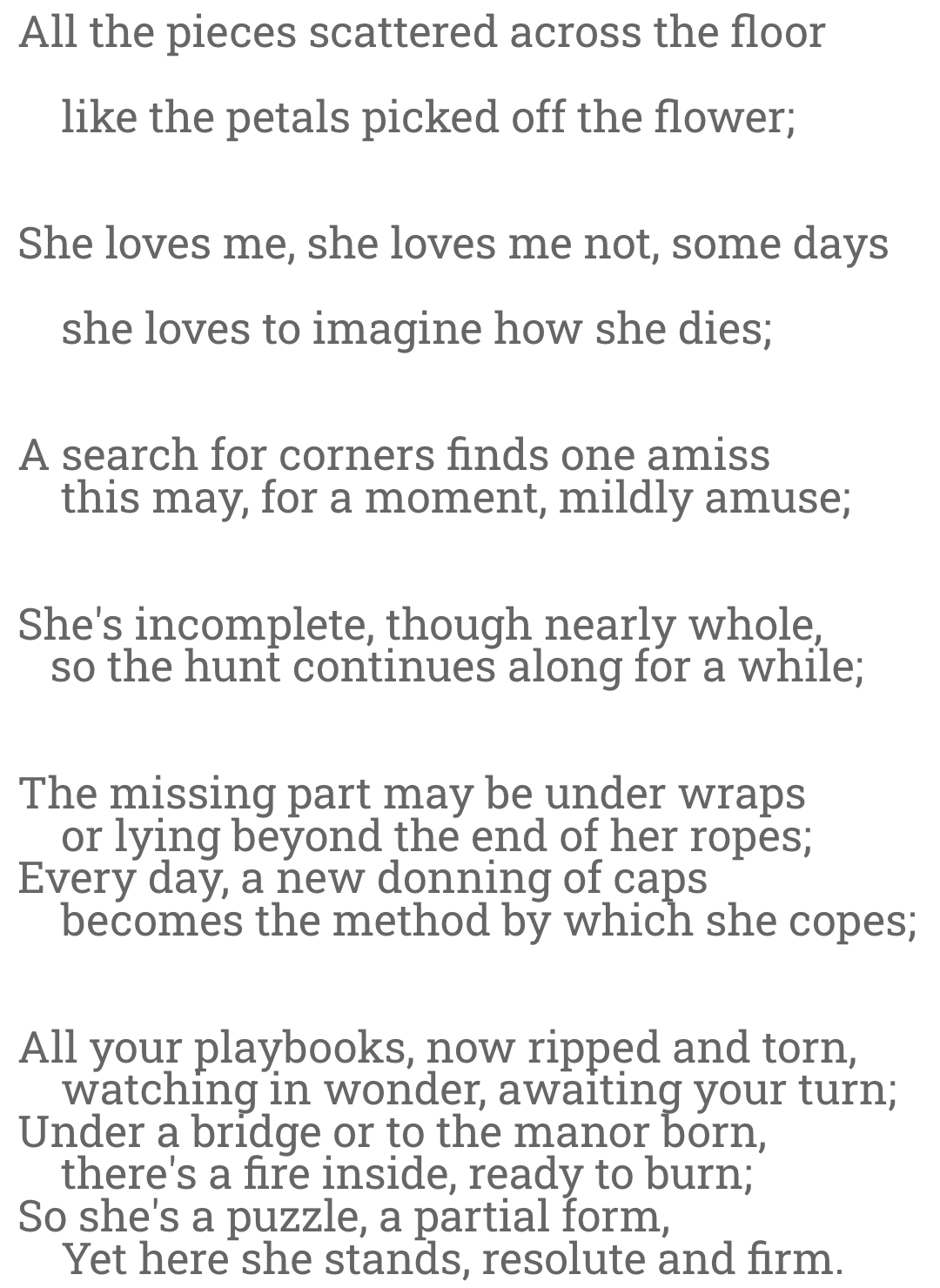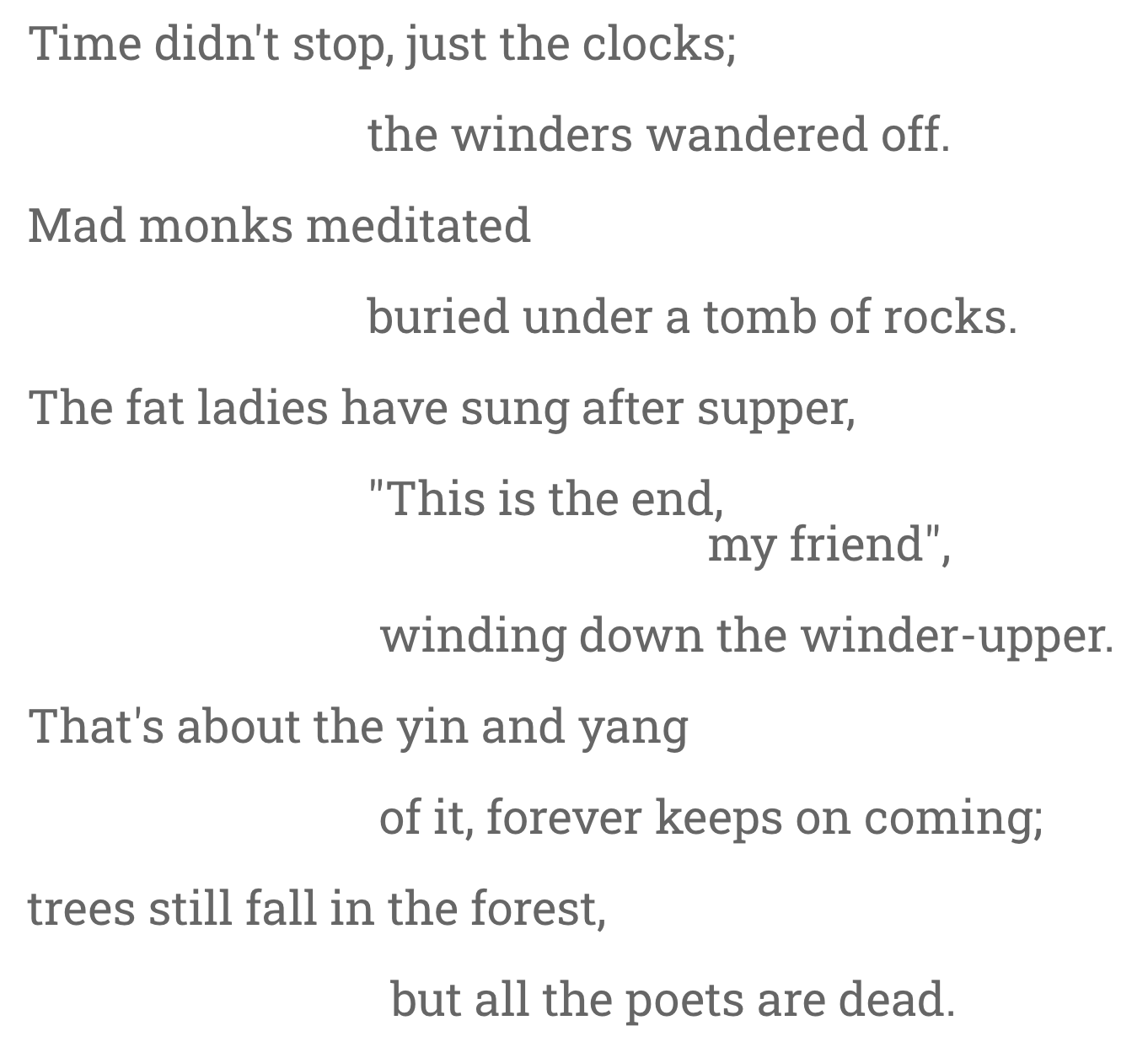 I haven’t got feedback on this assignment as I write this but I’m guessing that they will respond that it’s not exactly clear what this poem is about, and that’s a fair enough assessment. To be honest, I had the first and fourth lines jotted down and then tried to write rhymes around them and see what came out of that as the subject.