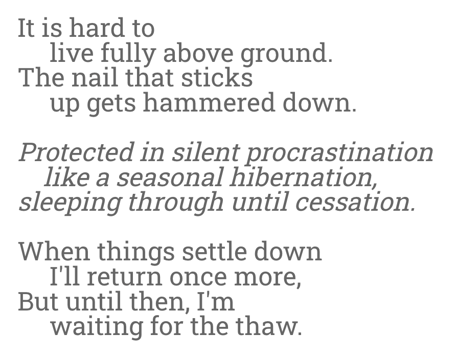 What a headache! A palindrome poem that is almost a double etheree. I gave up at the tenth line and had to enlist AI to give me ideas to connect the two etherees. It kinda works. I think the theme here is apparent but due to the structure of the palindrome, the specifics are a little bit lost. Does the formatting help or hinder?