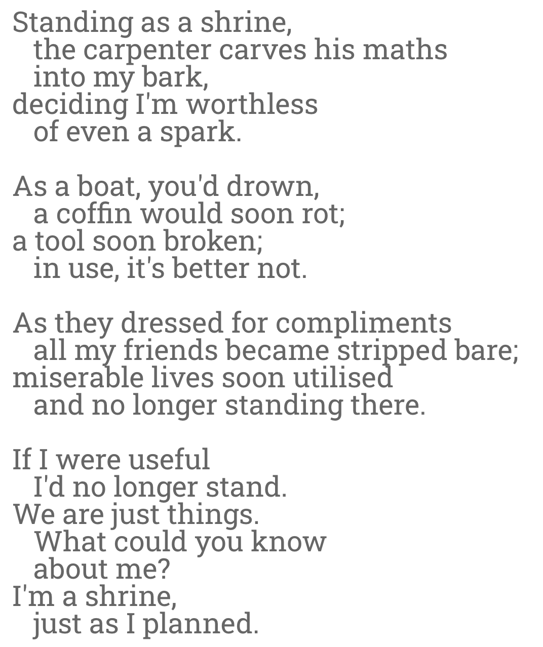 Standing as a shrine, the carpenter carves his maths into my bark, deciding I’m worthless of even a spark.