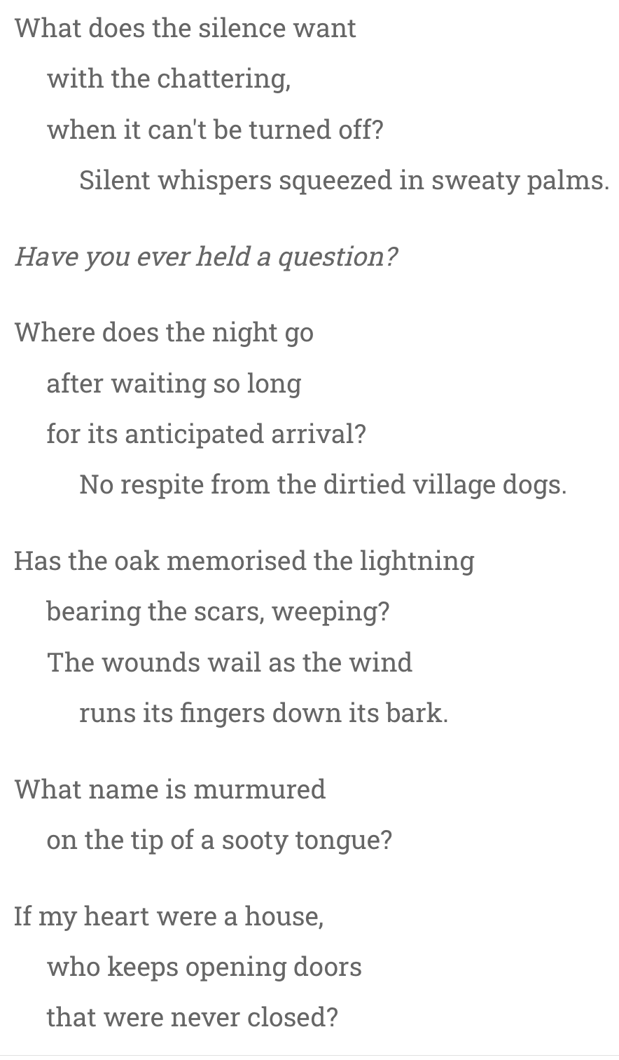 ‘If my heart were a house,who keeps opening doorsthat were never closed?’