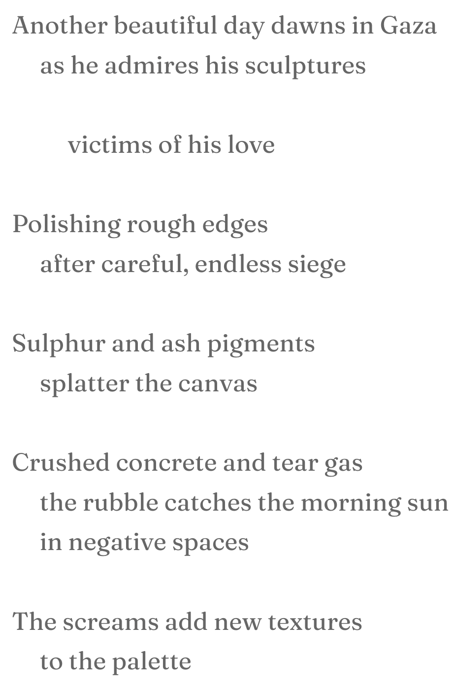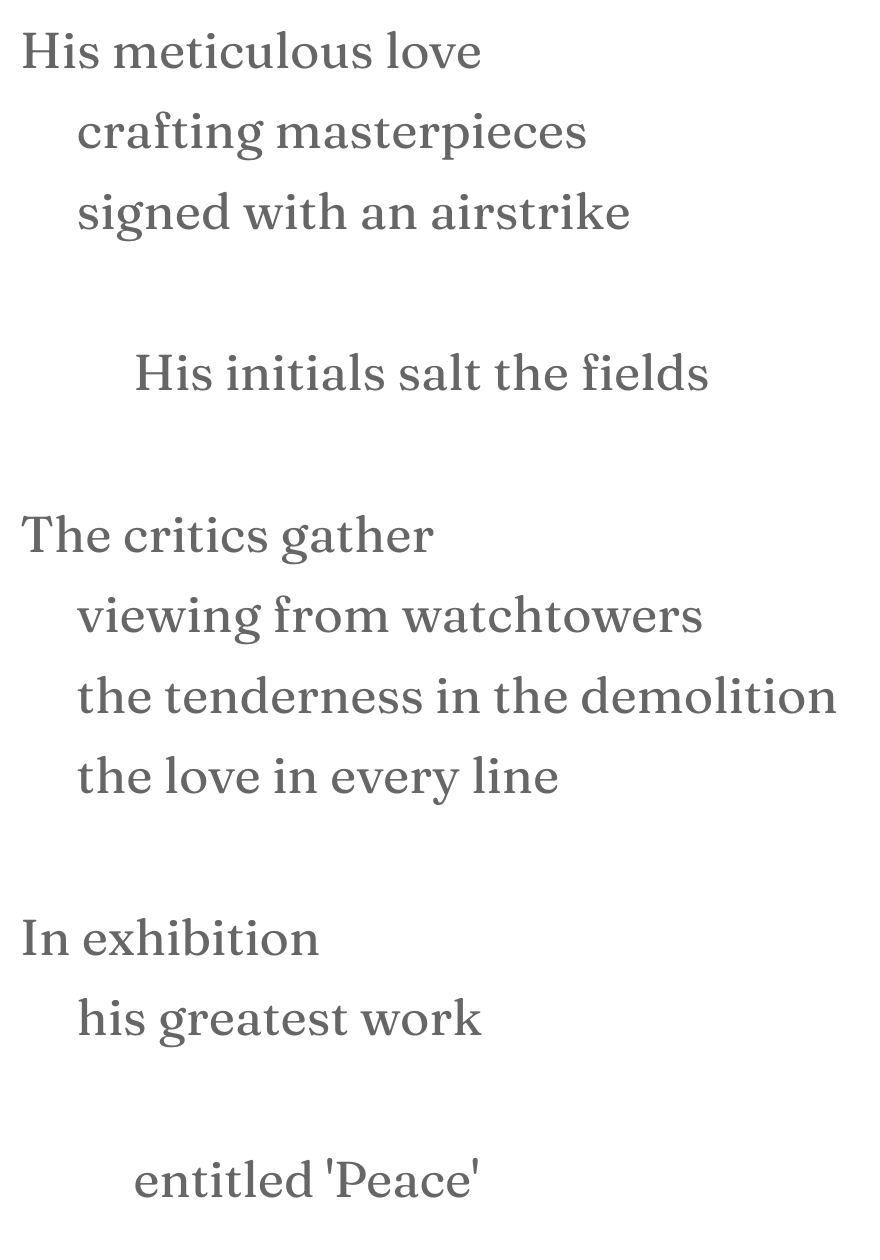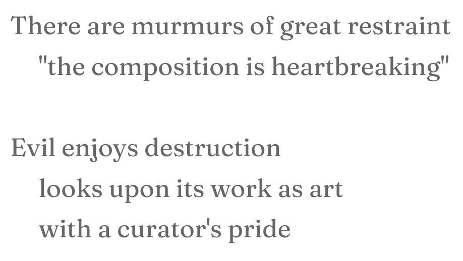This write is based on the idea that Gaza and the Palestinians are not victims of hate, but because evil loves destruction, they are, in fact, the victims of love. The art metaphor was inspired by the Red Hand Files #355