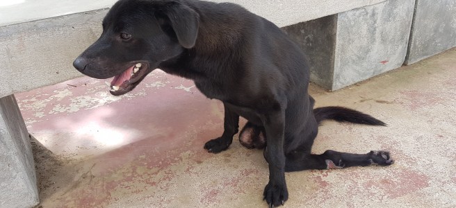 This lovely pup belongs to some workers at our school. He has a broken back and has to drag his back legs along the ground. He also can’t control his pee and poo. But he’s a happy dog still. The owner seemed to indicate it was himself who ran over the dog to cause its broken back, though we may have missed something in translation. Either way, he seems to be taking reasonable care of him now. His coat is clean and healthy at least.