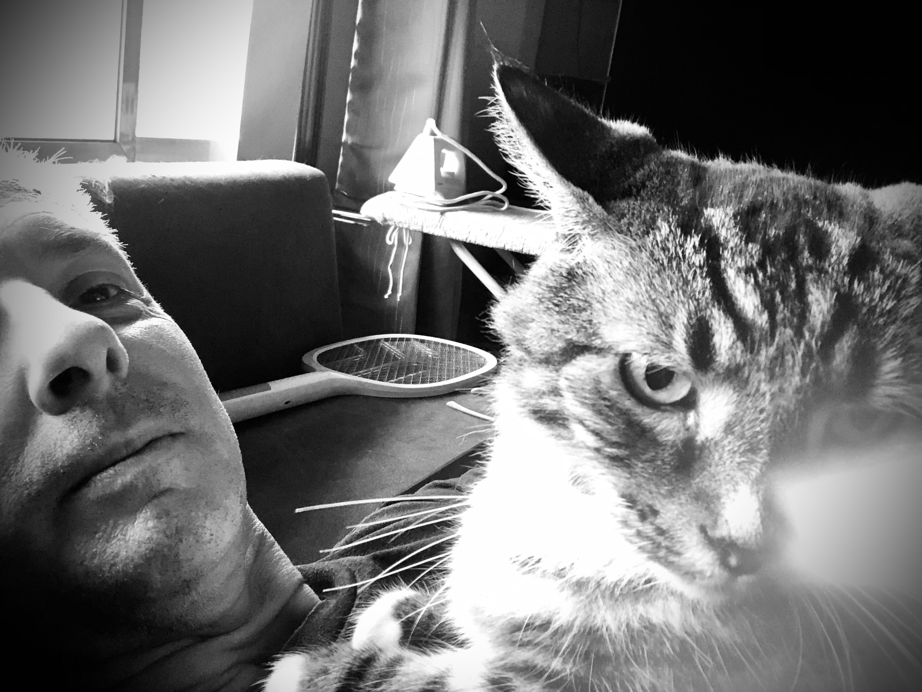 I took this picture because today is the first day it’s been cool enough to wear a t-shirt indoors. And when Tigger saw me laying down and finally clothed he started chattering away. I struggled to lift him from the floor and he settled on my chest before rolling into the crook of my arm and swimming away as I rubbed his fatty belly with deep rattling purrs. I don’t know why he only comes when I have a shirt on.