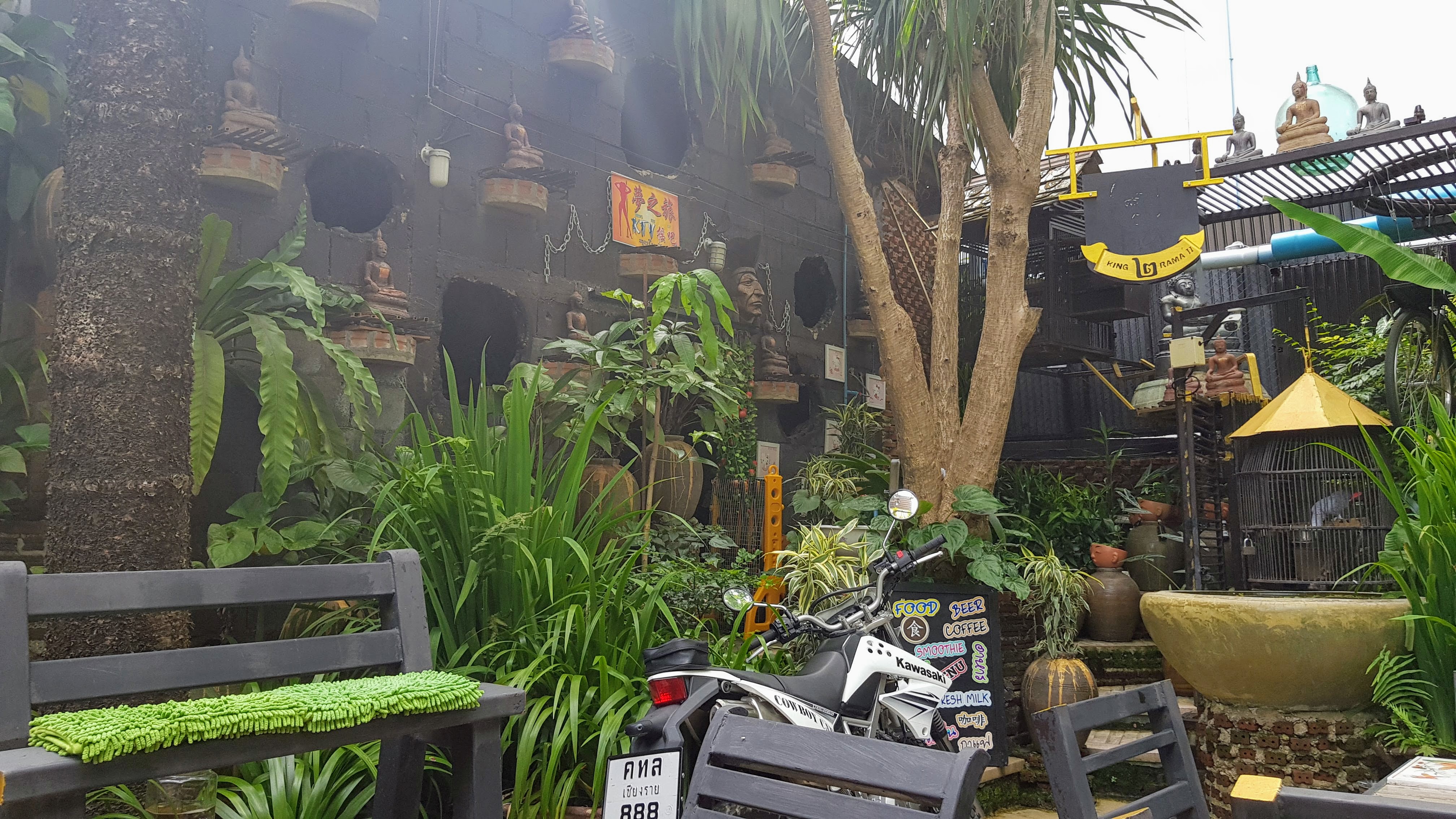The cafe is hidden away in a market, down a hallway that then opens out into this fantastic courtyard of artwork and decorations. All sorts of obscura adorn every space. In a shed area the owner keeps his batches of homemade hootch though he tells us that he was recently fined one hundred thousand baht and forced to pour it all away.