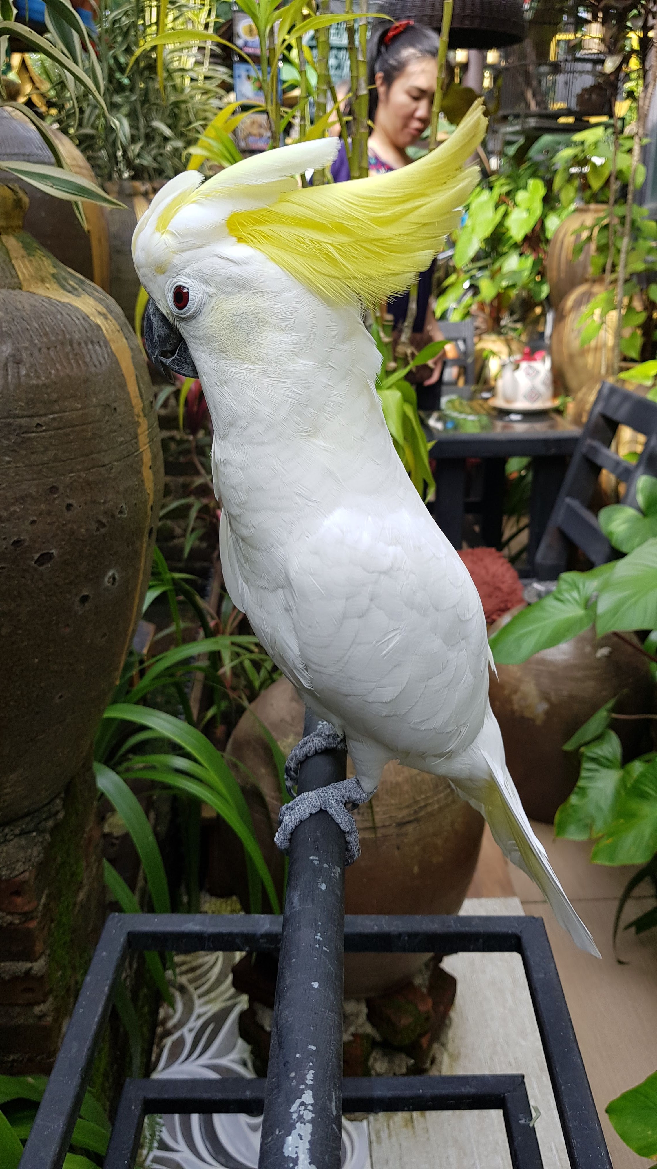 This parrot announces our arrival like a door chime fog horn and I jump out of my skin. Other birds step out but thankfully don’t squawk.