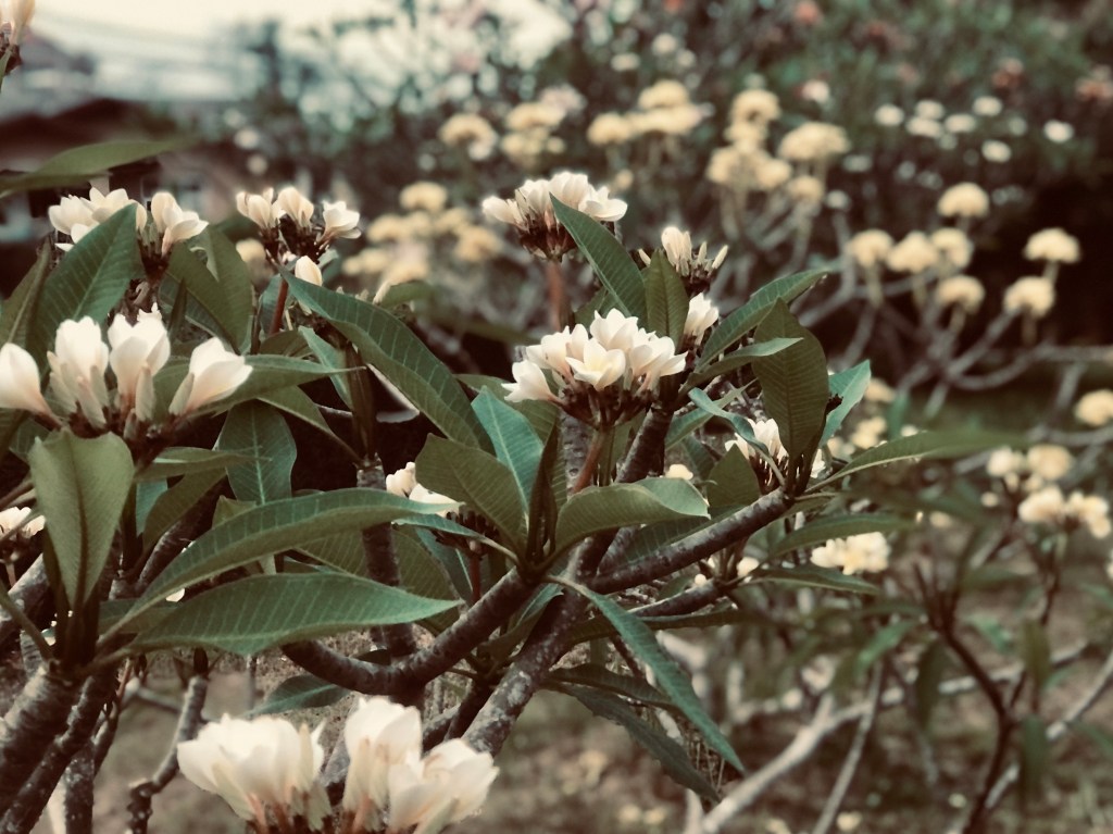 I took this picture because all our different frangipani trees are blooming. Big bunches of flowers get blown off in storms but each year there’s more and more. I love to see old frangipani trees. Ours are still young but I hope to see them old one day.