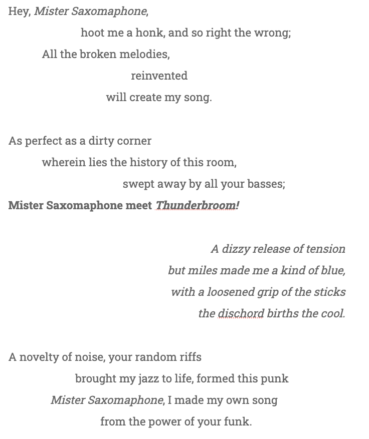 write a poem informed by musical phrasing or melody that employs some form of soundplay (rhyme, meter, assonance, alliteration). Also, the poem ‘In Evening Air by Theodore Roethke was suggested as an example, and I used the rhyming form, which I found quite pleasant and I think worked very well.