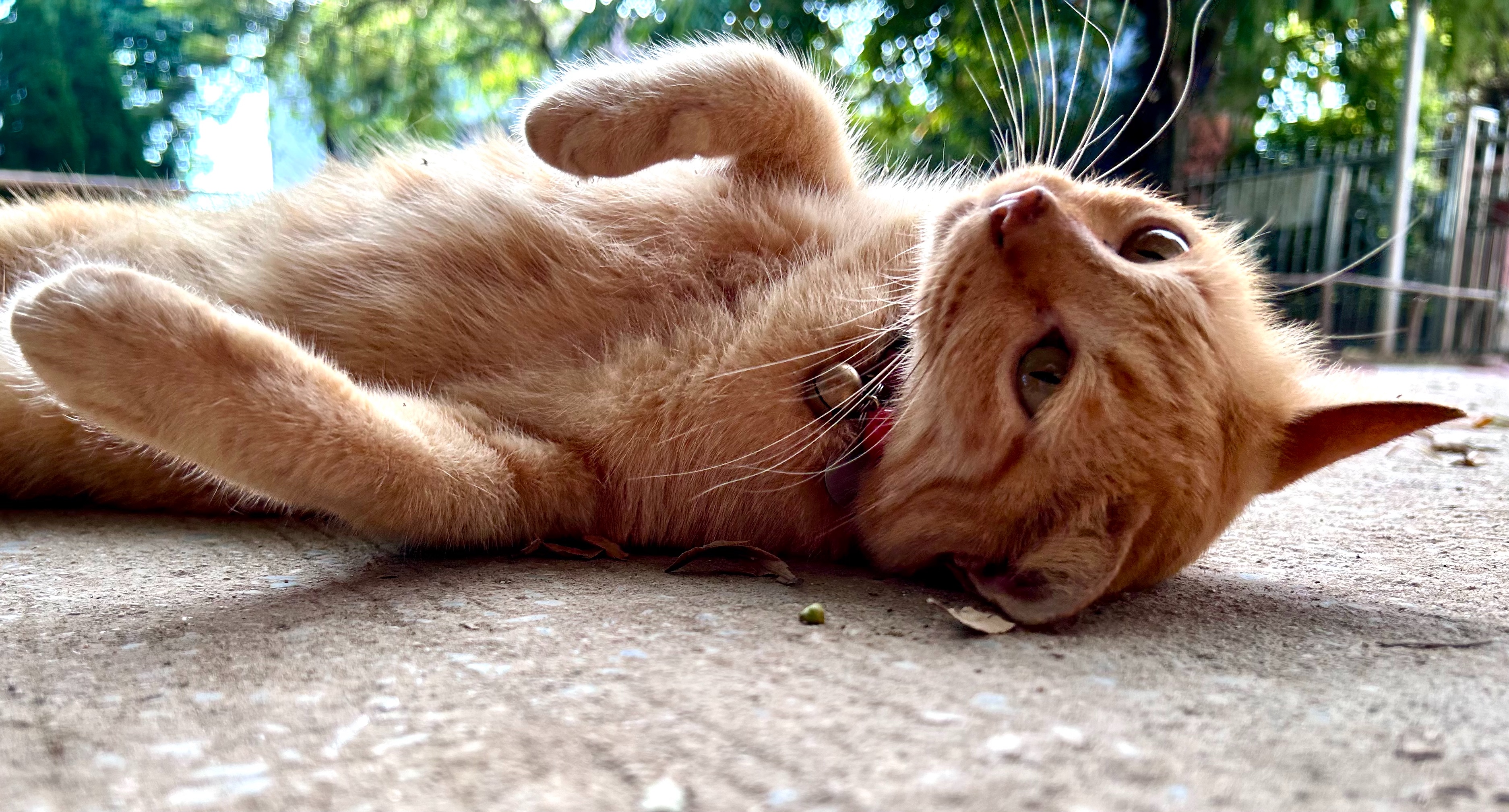 I took this picture because Garfield was rolling around at the entrance to school today. He(?) is really affectionate.