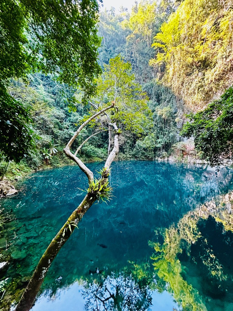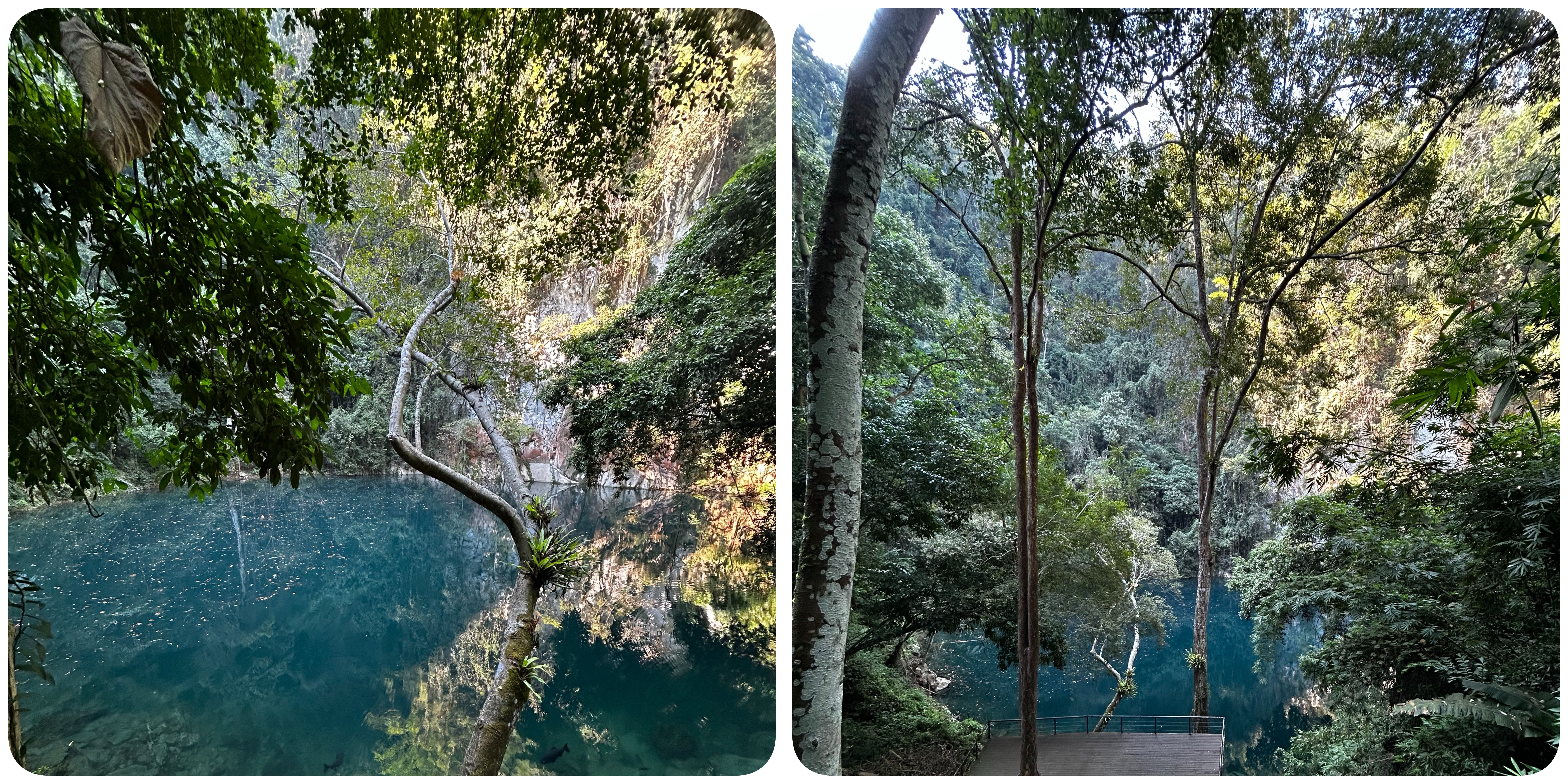 I took this picture because this is what we spent three hours traversing the back end of beyond to come and see. An emerald lagoon in a sinkhole in the jungle mountains near Lampang. The fish in there are huge and we wondered how they got there. Signs for no swimming, fishing or feeding the fish. There’s nothing else here except for a couple of big trees and once you’ve looked up and then back down again, you’ve seen a big tree. For some reason, the car park seemed to be able to accommodate a fleet of tour buses yet it’s at the end of a dirt track that a tour bus wouldn’t be able to navigate. The shop was on the far side of the car park so when we arrived a lady jumped on her motorbike and came to a makeshift stall next to the lagoon entrance, we happily wandered by on both entry, and fifteen minutes later on exit, and she happily rode her bike back across the car park to the shop. It was only 10 am. Maybe busloads of Koreans swamp the place come the afternoons?