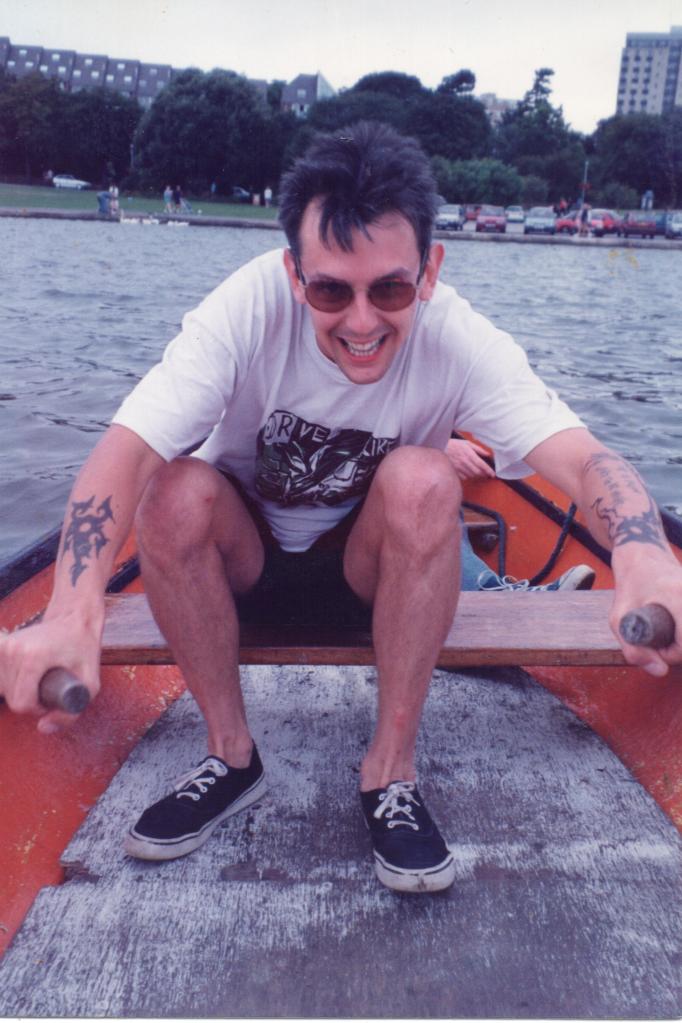 All the guys had gone except Rob who woke us up with breakfast and then fed, we walked down through the park to watch people lazying away their Sundays walking dogs, flying kites and taking in the sun. There’s been some powerboat racing around the harbour and also out on the sea over to the Isle of Wight. We fed up again in the Jolly Sailor, ambling slowly back to the park where we endangered ourselves with more fun by hiring out a row boat and rode ourselves into the night. No, not really. We rowed over to the other side to catch the cygnets and then back around everywhere, like Rob says, covering every inch of water.