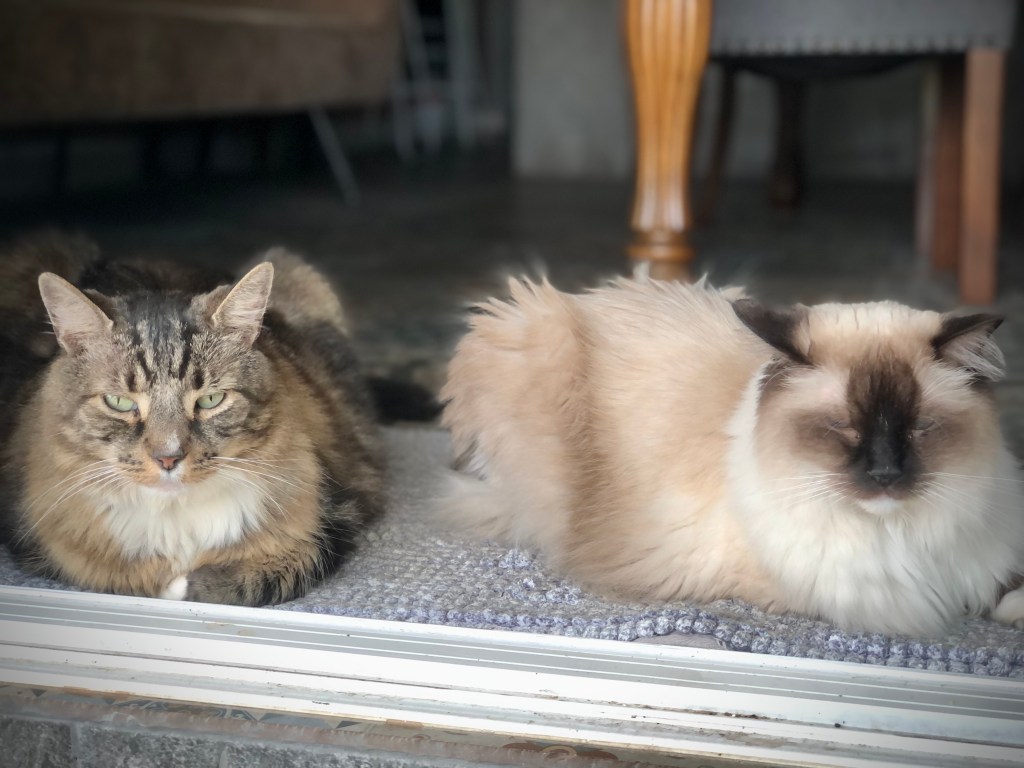 I took this picture because it’s unusual to find these two sitting together, both at the door looking out. I didn’t even notice them until I opened the door coming back from coffee.