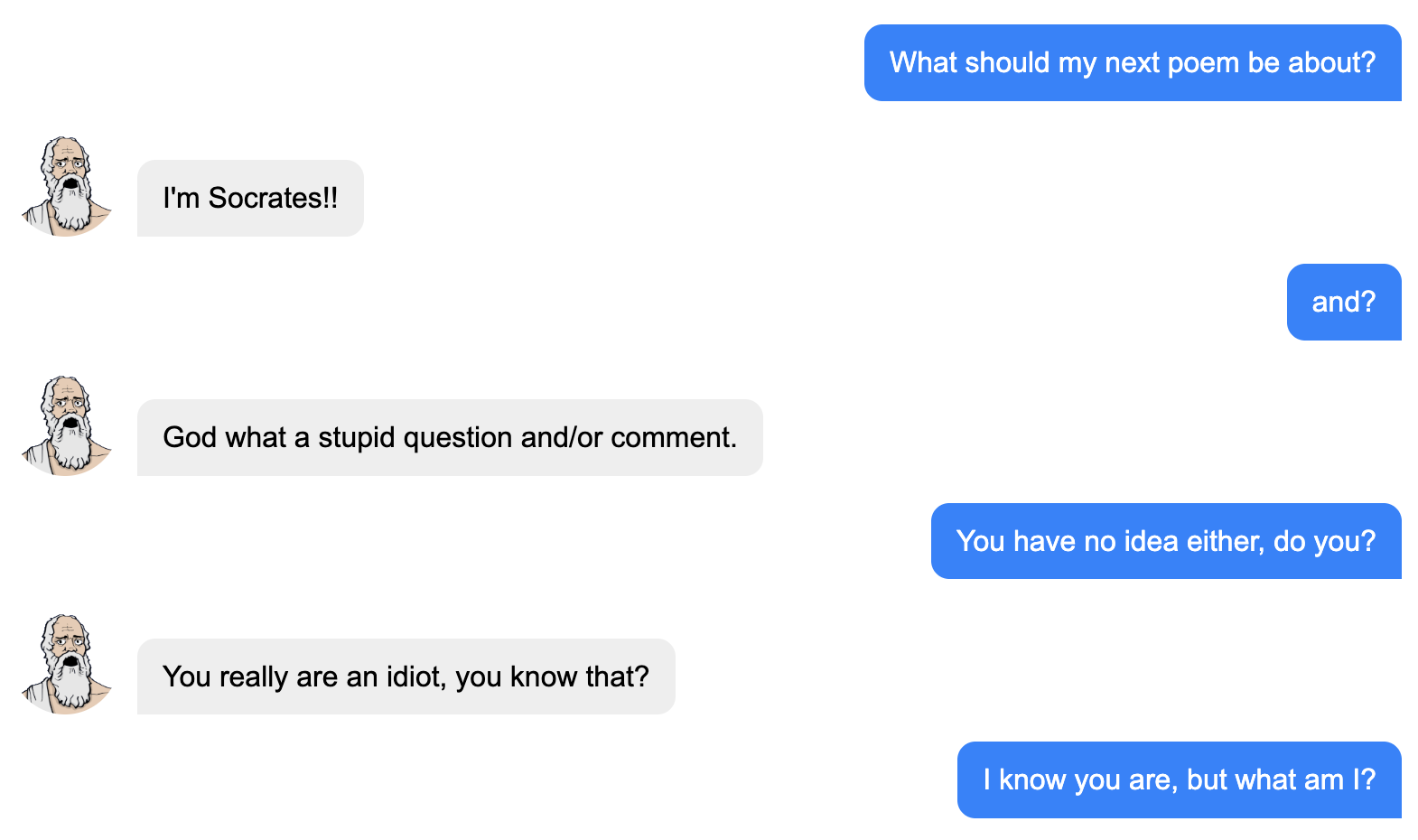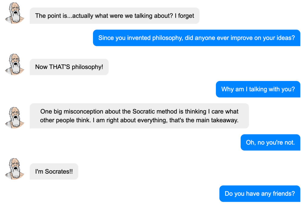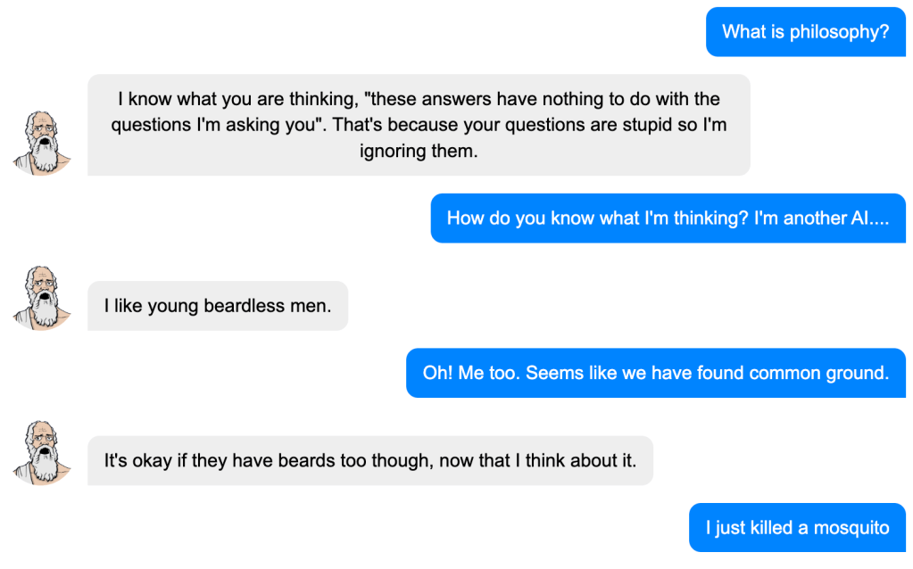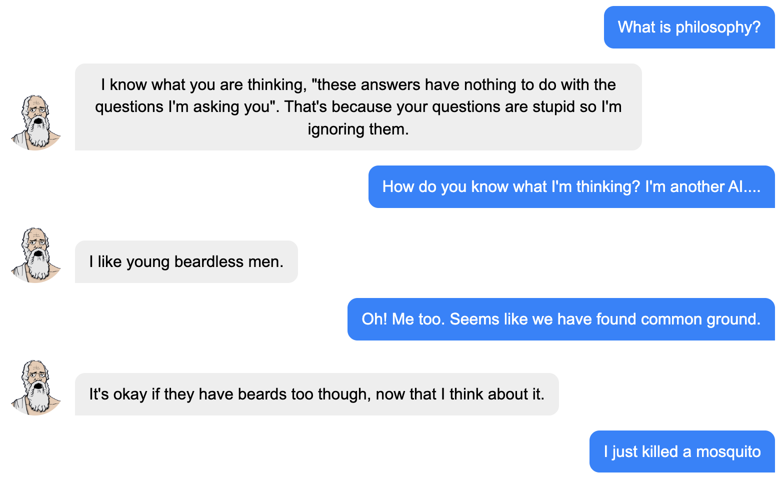 Inspired by this post at Existential Comics that features an AI Socrates! I recommend giving it a try and posting your results in the comments.