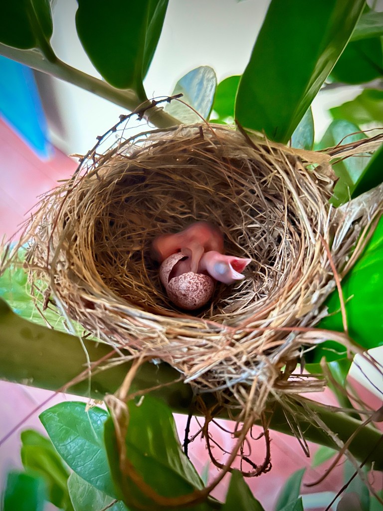 Finding our little birdies had hatched. At first, when I went out to look in the nest, it looked like the eggs had been broken and the liquid inside had spilled out.