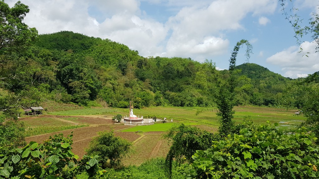 Then it’s onto the bypass – another scary proposition but at least there are not many side roads here for motorcycles to sudden pull out from, it’s just the speeding trucks to be aware of. Fortunately this newish road is still not used that much and it’s an enjoyable ride along. At the bridge I can see the stupa in the distance that is my planned destination (the little white dot on the mid-left in the picture above). The hill in the foreground grabs my attention though as there is a house up there as well as another Buddhist monument. How the hell do you get up there – the view must be amazing. One day in the future I will find out.