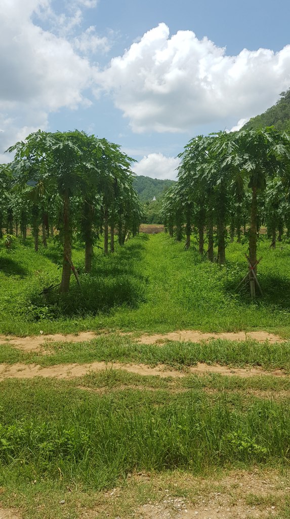 Here the vista opened up to these papaya trees and a happy dog was lounging in the shade of the rubber trees on the right.